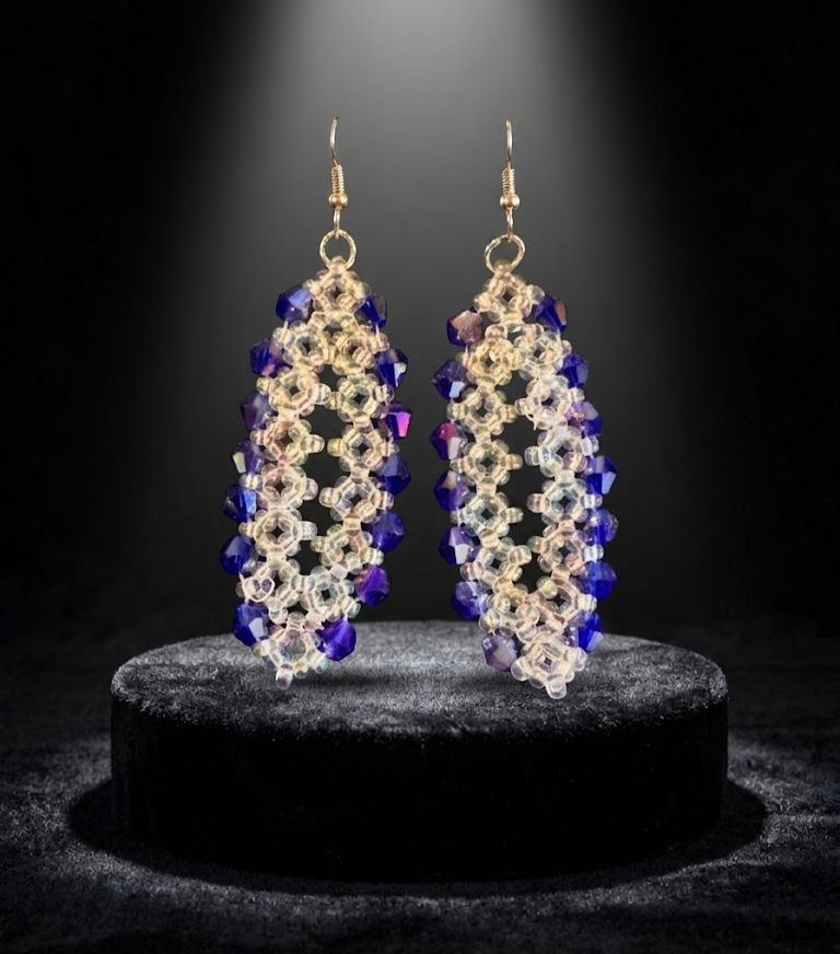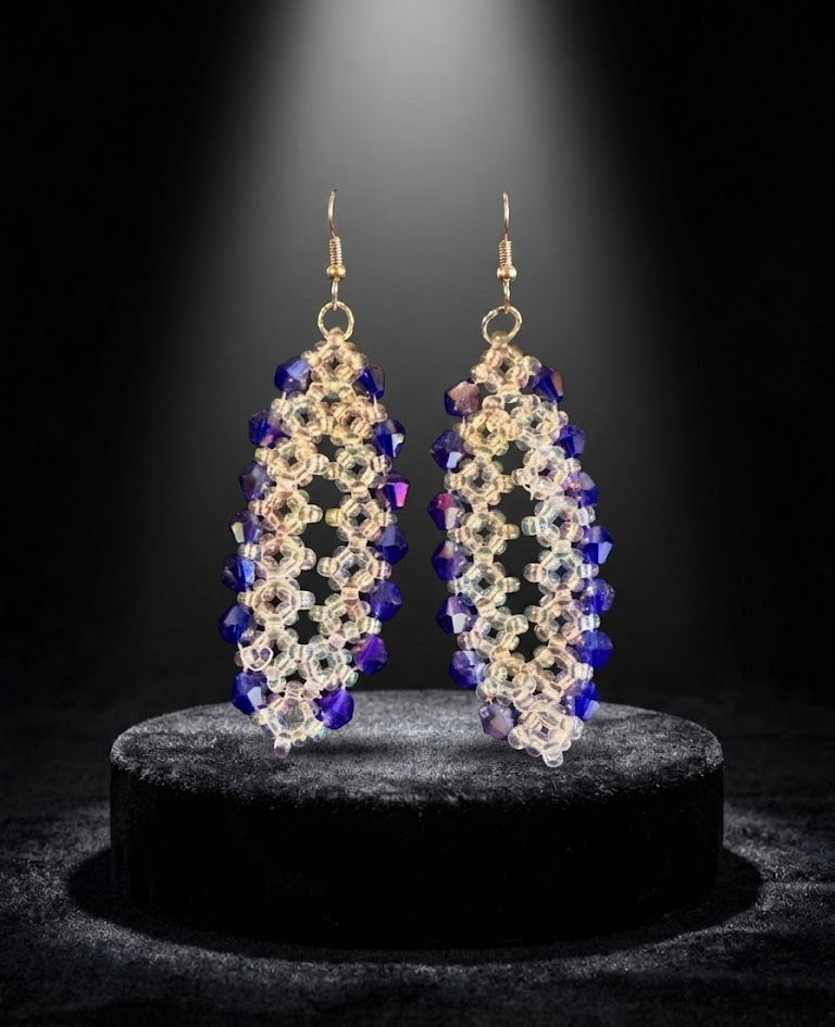 Ces boucles d’oreilles sont entièrement réalisées à la main, à partir de micro-perles translucides finement tissées. Leur structure ajourée, presque architecturale, est ponctuée de cristaux facettés aux nuances violet profond, créant un contraste délicat entre transparence et intensité.
